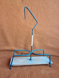 Le bottiglie sono appoggiate su un sostegno di legno e mantenute da una struttura metallica.