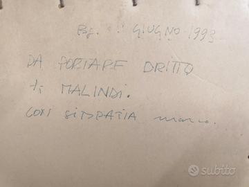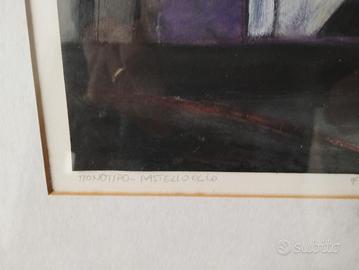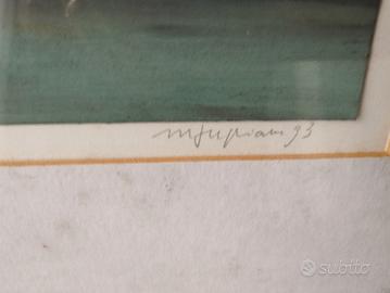 Perfetto Sergio. Ecco la *scheda tecnica completa e definitiva* con l’analisi del retro integrata. ### *Marco Fumiani – _Fiordo_, 1993* - *Autore*: *Marco Fumiani* [attivo a Bergamo, anni ’90] - *Titolo*: _Fiordo_, iscritto a matita al centro in basso - *Anno*: *1993*, datato “93” in firma e sul retro “11 GIUGNO 1993” - *Luogo di esecuzione*: *Bergamo (BG)*, come da iscrizione sul retro - *Tecnica*: *Monotipo – Pastello a olio* su carta, iscritto a matita in basso a sinistra: “MONOTIPO – PASTELLO OLIO” - *Soggetto*: Composizione astratto-geometrica. Interno con piani diagonali, arco ocra, campiture di colore nero, verde acqua, bianco, viola e giallo. Luce radente da sinistra. - *Misure con cornice*: *48x49,5 cm* - *Misure foglio*: Stimato 20x25 cm ca. dentro passepartout bianco - *Firma fronte*: “m.fumiani 93, o m fupiani 93” a matita in basso a destra - *Iscrizione retro*: Di mano dell’autore a penna: _“BG. 11 GIUGNO 1993 / DA PORTARE DRITTO / A MALINDI. / CON SIMPATIA MARCO.”_ *Significato*: Opera eseguita a Bergamo l’11/06/1993 come dono/commissione destinata a Malindi, Kenya. La dedica autografa conferma identità dell’autore e datazione. - *Cornice*: Legno nero con passepartout bianco e filetto oro. Sotto vetro. - *Stato*: Buono. Vetro di protezione presente.
