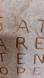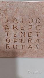 Incisione fatta da artigiano veneto su monocottura 20 x20 x1 cm. circa. Spedisco in tutta Italia. Info 347 3172645 Il Quadrato del Sator è un famoso palindromo latino, spesso trovato in epigrafi in tutta Europa (Pompei, Siena, ecc.), che forma un quadrato di 5 parole: SATOR, AREPO, TENET, OPERA, ROTAS. La frase, leggibile in ogni direzione, significa approssimativamente: "Il seminatore Arepo tiene con cura le ruote" o "Dio governa le opere". Università Bocconi Università Bocconi +4 Ecco i dettagli principali sul misterioso quadrato: Palindromo e Struttura: La frase si legge allo stesso modo da sinistra a destra, da destra a sinistra, dall'alto in basso e dal basso in alto. TENET è una croce palindroma centrale. Significato Incerto: La parola AREPO non esiste nel latino classico, probabilmente di origine celtica (aratro). Interpretazione Cristiana: Si ritiene un simbolo dei primi cristiani. Anagrammando le lettere si ottiene due volte la croce con "Pater Noster" accompagnato da A (Alfa) e O (Omega). Interpretazione Agricola: Il seminatore (Dio) guida con perizia le ruote (l'universo/il destino). Origine: La traccia più antica è stata rinvenuta a Pompei (prima del 79 d.C.), indicando una storia bimillenaria.