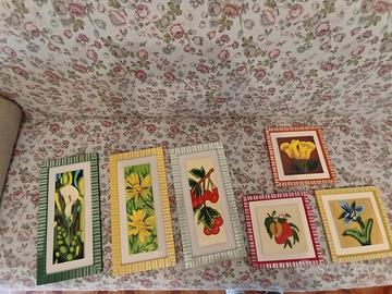 Vendo 6 quadretti, colori allegri, adatti per la cucina o il soggiorno. Tre quadri misurano 40x20 cm. Gli altri tre misurano 23x23 cm. I quadri sono in ottimo stato.