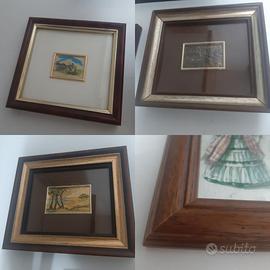 3 quadretti con cornice marrone dipinti a mano su foglia d'oro + 1 quadretto con cornice marrone e stampa semplice.