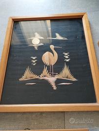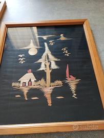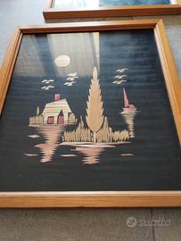 vendo 3 quadretti rappresentanti paesaggi realizzati con pezzetti di bambù incollati su tela nera . il prezzo è di tutti e 3