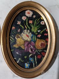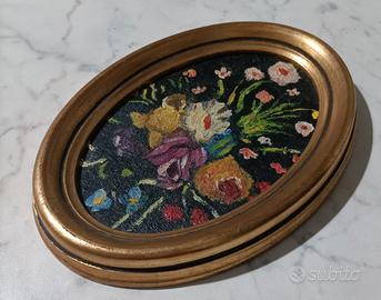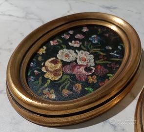 Vendo da foto set di 2 Ovali Vintage con cornice in stile fiorentino in legno e oro, con fiori dipinti a olio su legno. Classico Italiano.