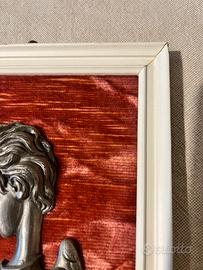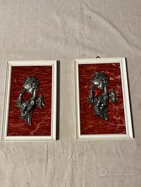 Quadretti vintage, due, con basso rilievo in peltro, raffigurante angeli in preghiera, su sfondo in velluto rosso. Articolo da collezione risalente agli anni ‘70.