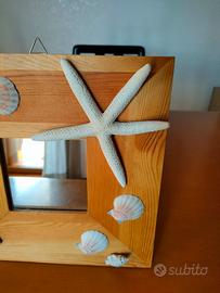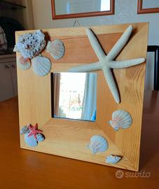 Quadretto in legno con piccolo specchio ed elementi marini. Dimensioni 25,5x25,5cm