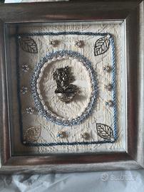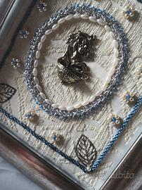 Piccolo quadretto con cornice in legno argentata. Al centro piccola acquasantiera in argento, impreziosita con ricami di perline pietre di fiume e di vetro. Ai 4 angoli foglioline in metallo. Pezzo unico non ripetibili interamente fatto a mano