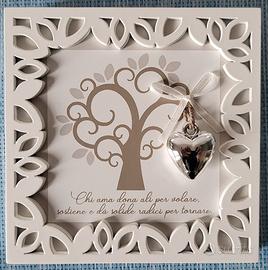 Quadretto "Albero della vita", in legno bianco, con su scritta la frase "Chi ama dona ali per volare, sostiene e da solide radici per tornare" e ciondolo a forma di cuore argentato