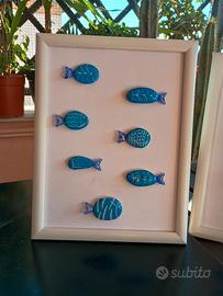 Quadretti artigianali, realizzati a mano utilizzando sassi di mare, dipinti, decorati e smaltati, colori a scelta, in ogni quadretto ci sono sette sassolini, in cornice nuova di legno bianca cm 19 x 25, la richiesta è di 10 euro l'uno,nel mio armadio altre creazioni sempre realizzate con gli stessi materiali