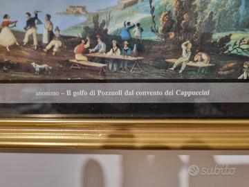 Quadretto con stampa di Napoli raffigurante il Golfo di Pozzuoli visto da convento dei Cappuccini. Cornice dorata. Dimensioni 26 cm x 37 cm.