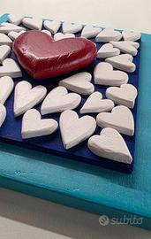 Si tratta di un pannello composto da due livelli: una base in legno e un secondo pannello più sottile sovrapposto, su cui sono applicati numerosi cuoricini scolpiti e dipinti uno ad uno, con un cuore centrale più grande in rilievo che cattura subito lo sguardo.