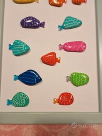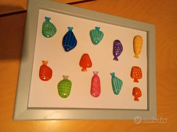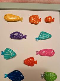 Quadretto di legno colore verde acqua cm 18 x 24, pesciolini di sassi dipinti,decorati e smaltati a mano