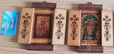 Vendo per 19 euro quadretto immagine icona d'arte sacra della Madonna nera di Czestochowa con Gesù bambino. Lo si può aprire e chiudere a piacimento (tipo finestra) e con rifiniture del legno lavorato a mano, c'è il gancino per appenderlo. Risale agli anni 60 e proviene da Częstochowa in Polonia. Ho un altro quadretto dell'iconografia della Vergine Maria che vendo allo stesso prezzo, comprandoli entrambi il totale sarà di 34 euro anziché € 38, possono presentare delle imperfezioni dovuto al tempo trascorso. Ho molti altri quadri, piatti e manufatti in legno, ceramica, porcellana, cristallo, vetro, metallo, resina ed altri materiali, alcuni in queste foto. La tessera è per comparare la dimensione. Ne ho altri di vario genere, dimensioni e formati differenti, sia italiani che stranieri, alcuni dipinti e lavorati a mano. Chi interessato mi scriva in privato.