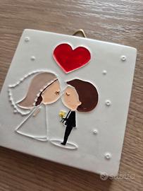 🤍 Quadretto in ceramica dipinto a mano, con raffigurazione sposi. Dimensioni 10x10cm, 1cm di profondità . Può essere appeso con il gancio o con il magnete.