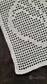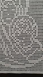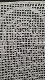 Pannello rettangolare 19 cm x 25 cm in pizzo filet interamente lavorato a mano all'uncinetto con grande maestria attraverso l'alternanza di maglie vuote e piene che raffigura con estrema delicatezza l'immagine sacra della Madonna con Gesù Bambino, bianco candido. Può essere incorniciato, fissato ad una piccola bacchetta di legno o ferro o applicato su un cuscino decorativo o su una tenda.
