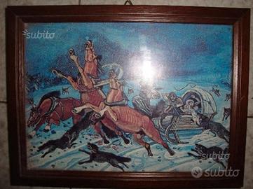 Splendido quadro rappresentativo di una scena di attacco di Lupi, nei confronti di una famiglia in slitta da neve.