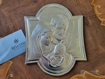 Quadretto icona Santa Famiglia in legno e argento, da appoggio o da parete.