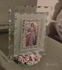 Quadretto sacro raffigurante Gesù Misericordioso realizzato su supporto in vetro lavorato con elegante bordo ondulato e base decorativa con rose.