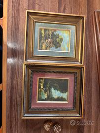 3-4. Due piccoli oli gemelli: casolare con figure + sentiero boscoso con figura. Non firmati, cornici dorate, ~25-35 cm ciascuno. Decorativi.