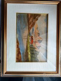 “La chiesetta sul lago alpino” : Il dipinto raffigura un paesaggio montano di atmosfera alpina, probabilmente ispirato a zone dolomitiche o nord-europee. Al centro della composizione si staglia una piccola chiesa con tetto rosso, isolata e raccolta, posta sulla riva di un lago calmo che ne riflette l’immagine.