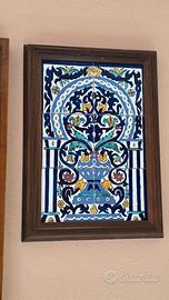 Inoltre, vendo raffinato quadro d’arredo caratterizzato da una maiolica centrale in ceramica, interamente dipinta a mano con scene classiche. La ceramica è incastonata su un elegante fondo scuro che mette in risalto la luminosità della pittura e della cornice.