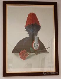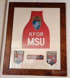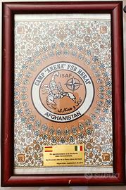 Omerali missioni militari internazionali di pace con relativi distintivi. In regalo cornici in legno e vetro come in foto contenenti n.2 stampe raffiguranti rispettivamente un Ufficiale dei Carabinieri in uniforme da cerimonia e una Lucerna (cappello storico dell'Arma dei Carabinieri) entrambe dimensioni di circa 40 cm x 60 cm e n.1 cornice in legno lievemente danneggiata come in foto contenente un tappetino raffigurante il logo della base militare multinazionale ad Herat (Afghanistan) dimensioni 24 cm x 36 cm.