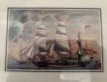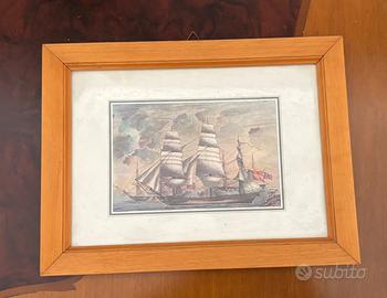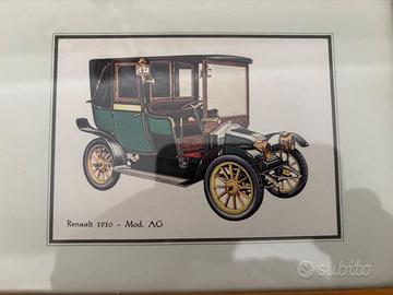 Coppia di quadri vintage con serigrafie che rappresentano una Renault del 1910 e un veliero