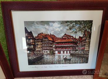 Quadri con cornice in legno effetto cuoio di colore bordeaux. Hanno dimensioni L 45 cm, H 33 cm e spessore 15 mm. Stampe illustrative di Strasburgo: la Maison des Tanneurs e la Cattedrale. E' preferibile la consegna a mano in zona, altrimenti in caso di spedizione, le spese sono a carico del destinatario.