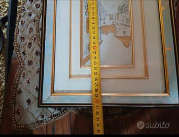 Vendo quadro decorativo con incisioni su metallo raffigurante un suggestivo vicolo di un borgo italiano. Dettagli dorati in rilievo e finitura lucida.