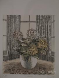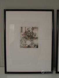 N° 2 quadri "vaso di ortensie" e "vaso di rose" di L. Schiavo, con cornice nera lucida, incisioni al torchio colorate a mano, 30x40 cm. Vendibili in coppia o singolarmente.
