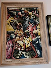 Il quadro nell'immagine è un dipinto a olio su tela raffigurante una scena rurale o cerimoniale, in particolare identificato come un'opera nello stile dell'arte popolare haitiana.