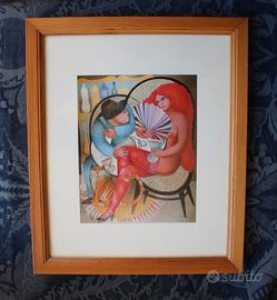 Graziosi quadri a contenuto erotico, colori vivaci, con soggetto comune ad entrambi: una donna libertina con capelli rossi molti lunghi ed un uomo con cappello in testa. Autore: G. Pandolfi. Dimensioni di ciascun dipinto 14x18 cm, dimensioni di ciascun quadro compresa cornice in legno 26,4x31,4 cm. Il prezzo è complessivo per entrambi i quadri.