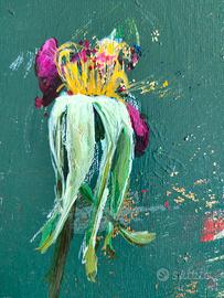 Coppia di quadri bellissimi olio su tela, rifinitura brillante, sfondo verde scuro con tecnica di graffi di foglia d'oro, soggetto: la fine della fioritura di una rosa. Pronti da appendere, bordi laterali alti 2cm dipinti verde come il quadro. Dimensioni: 30 X 20 cm ognuno. Non si vendono per separato. Soggetti unici. Peso di entrambi dipinti 650gr. I quadri sono montati su cornice di legno.