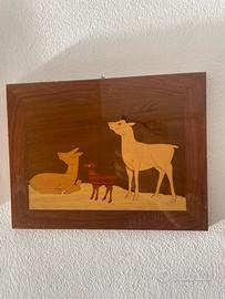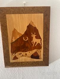 Tris di quadri artigianali realizzati con la tecnica dell'intarsio su legno, ratfiguranti cervi in ambientazione montana. Perfetti per arredamento in stile rustico, baita, casa di montagna o agriturismo.