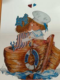 I quadretti raffigurano due bambini, maschio e femmina, che si baciano.