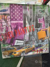 Colori vivaci, immagini iconiche (taxi gialli, bandiera americana, skyline, insegne di Times Square, Flatiron Building e Chrysler Building), perfetti per arredare salotto, camera, ufficio o studio.