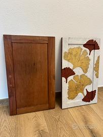 Pannelli decorati, legno massello, ricavati da vecchi sportelli. Decorazione con foglie di gingko in acrilico e foglia d’oro. Misure del singolo pannello 34x56 cm. Il prezzo si riferisce alla coppia.
