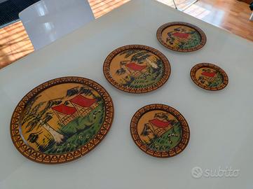 Vendo un set di 5 piatti / piattini / quadri / quadretti decorativi da parete dipinti dipinto a mano in legno in buone condizioni per inutilizzo. Come da foto vanno dal più grande al più piccolo.