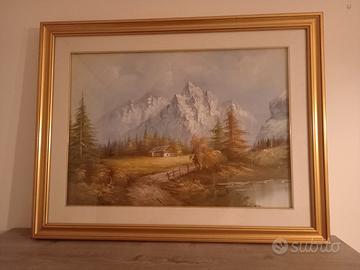 Quadro ad olio “Baita in montagna” misure cm. 70 x h. 50, con cornice cm. 87,8 x h. 68. Si vende a € 80.