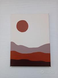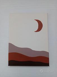 Vendo coppia quadri stile boho/moderno con sole e luna, ideali per arredare salotti e camerette. Acrilico su tela di cotone, colori della terra. Misure 18×24 cm.
