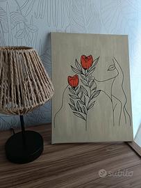Vendo quadri realizzati a mano, stile moderno-minimalista. Le opere raffigurano figure femminili delineate con linee nere sottili e fiori rossi stilizzati. Le tele hanno uno sfondo beige neutro che si adatta facilmente a qualsiasi tipo di arredamento