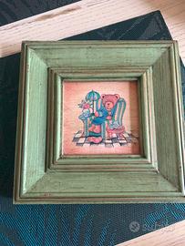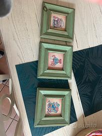 Tre quadri stile country con cornice verde salvia tutti in legno e dipinti su legno. Misura 22x22 ciascuno.