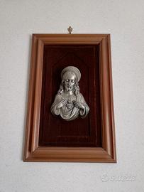 - Quadro religioso con altorilievo in peltro cesellato a mano raffigurante Gesù Cristo su fondo di velluto marrone e cornice in legno, 47×30,5cm
