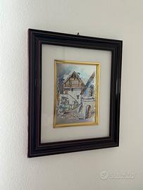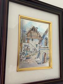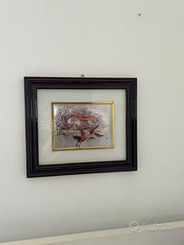 quadro 1: L'opera è un bassorilievo su lastra d'argento (o metallo argentato), una tipologia di manufatto artistico-decorativo molto diffusa in Italia, specialmente tra gli anni '70 e '90. Raffigura uno scorcio architettonico di carattere rurale o montano. Al centro spicca una tipica baita o casa di borgo con un loggiato in legno, scale esterne in pietra e un arco d'ingresso che suggerisce profondità. Lo stile è figurativo e nostalgico, tipico delle botteghe artigiane italiane (come quelle di Carullo, R. Pighetti o Acca). La tecnica del bassorilievo conferisce un effetto tridimensionale che gioca con i riflessi della luce sulla superficie metallica. quadro 2: L'opera è un esempio di arte naturalistica vintage, un genere molto popolare per l'arredamento d'interni, specialmente tra gli anni '70 e '90. II punto focale è costituito da due anatre selvatiche colte in pieno volo. La loro posizione diagonale conferisce un forte senso di dinamismo e movimento alla scena. Le anatre sorvolano uno specchio d'acqua calmo, probabilmente uno stagno o un fiume lento. Sulla riva opposta si erge una struttura rustica, un vecchio mulino o un fienile dal caratteristico tetto rosso, circondato da alberi spogli o autunnali, il che suggerisce una scena ambientata in una stagione di transizione come l'autunno o l'inizio dell'inverno.