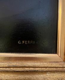 Quadro vintage decorativo dipinto a mano, raffigurante una splendida natura morta con frutta e fiori, firmato “G. Ferri”.
