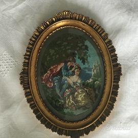 N° 2 quadretti con raffigurazione allegorica a punto GOBELIN inserite in cornice di legno ovale dorata Misure 30x23