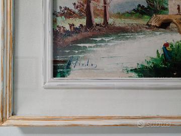 quadro paesaggistico a olio di Henning Landor. Il soggetto è un paesaggio fluviale con un ponte e una piccola costruzione. Misura cornice esterna 60x50