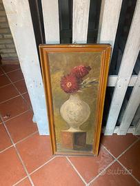 Vendo elegante dipinto a olio su tela (o tavola) raffigurante un vaso con fiori rossi, incorniciato con cornice in legno dorata.