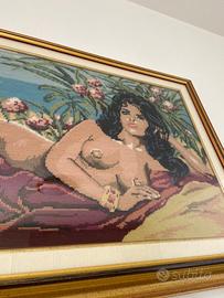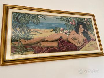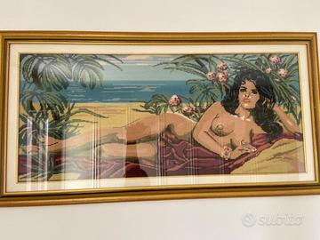 Quadro ricamo a punto croce con cornice in legno color oro. Ottime condizioni. Ricamo fatto a mano Cornice in legno + vetro Dimensioni: 60 x 100 cm