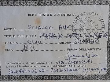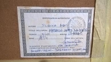 Quadro di A. Sciacca, dal titolo "Paesaggio sotto la neve". Con certificato di garanzia. Misure in centimetri: 115x65 con la cornice. Rif. Massimo