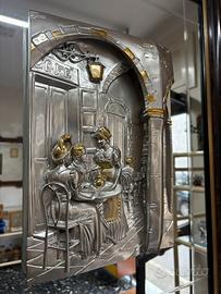 Quadro a specchio con bassorilievo, pellicola argento. Cornice in radica. Misure : 72 cm x 58 cm.